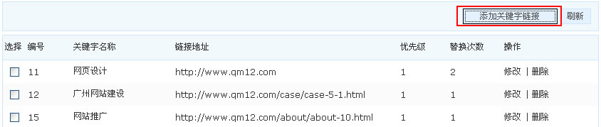 1.下面这个是内链的关键字列表,可以无限增加关键字,但清木网站建设提醒各位,千万不要设置太多哦,10个左右比较全适,如果文章比较多的话,可以适当增加一些。