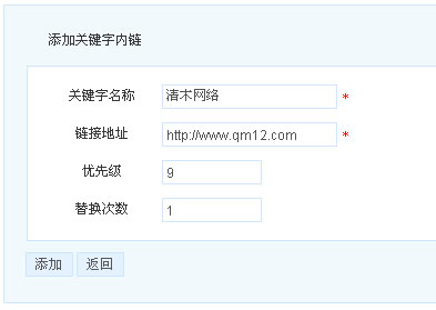 2.下面这个是增加关键字,可以设置关键字的链接,优先级别,替换次数等。这里清木想重点说下优先级别,数字越小,级别越高。比如:当你设置了两个关键字,“广州网站建设”、“网站建设”,如果“网站建设”的级别高时,假如文章中包含“广州网站建设工作室”这段话时,只会给“网站建设”这个关键字增加内链,而不会给“广州网站建设”增加内链,反之亦然。